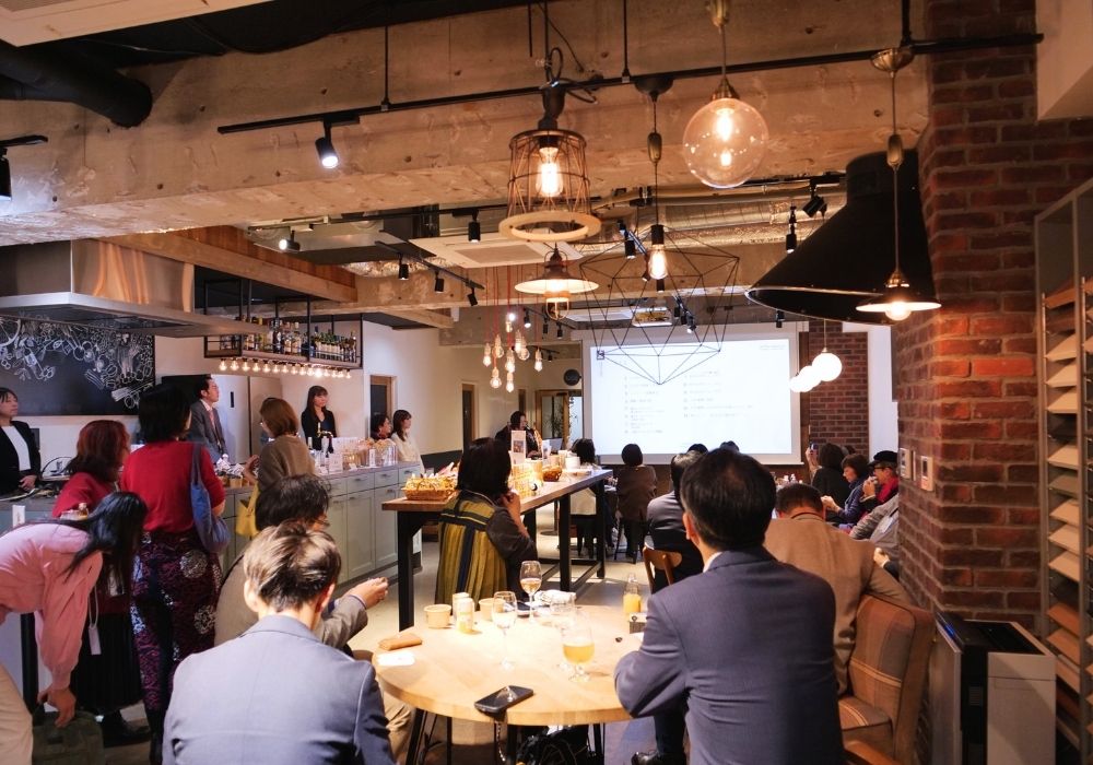 受付開始とともに、皆さまには名刺交換を交えながら、みかんジュースやワインを片手にまずは自由にお過ごしいただきました。和やかな歓談が生まれ、会はリラックスした雰囲気でスタートしました。